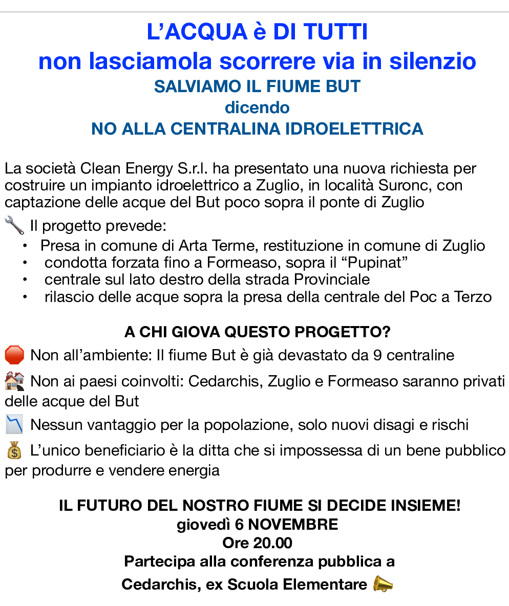 Giovedì 6 novembre a Cedarchis alle ore 20 l’appuntamento con il comitato contro la paventata costruzione di una nuova centralina lungo il Torrente But.