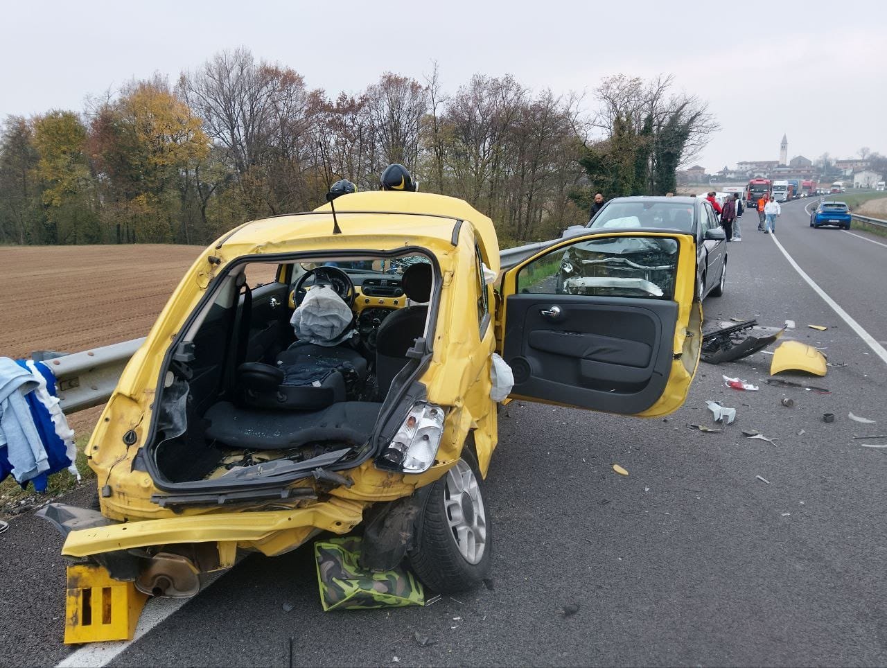 Incidente intorno alle 14,30 lungo la “strada osovana” nel tratto della variante che aggira il centro abitato di Colloredo di Monte Albano. Due auto coinvolte. La donna alla guida della 500 gialla, una maestra elementare dopo essere stata estratta dai vigili del fuoco con i divaricatori idraulici dall’abitato è stata trasferita in volo all’Ospedale di Udine dove si trova ricoverata in gravi condizioni per i traumi riportati. Non sarebbe in pericolo di vita. L’altra conducente è stata trasportata in ambulanza all’ospedale di San Daniele del Friuli per accertamenti. L’arteria è rimasta chiusa al traffico per diverso tempo per permettere le operazioni di soccorso e la successiva rimozione e pulizia. Non si esclude il malore da parte della conducente della 500 gialla la causa della carambola tra le due auto.